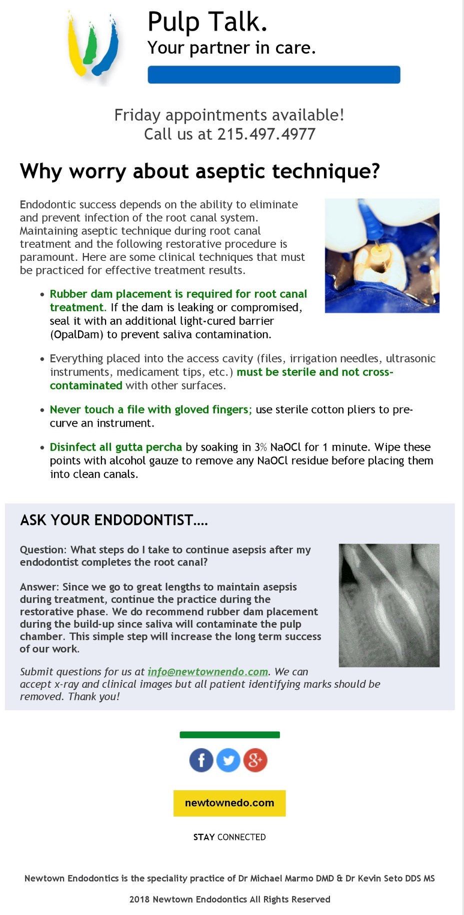 答え;無菌的な状態を維持するために、被せる段階にも無菌的な処置を行っている。すなわち、歯の頭の部分を構築する際、コアを作る時にも、唾液が入り込まないようにラバーダムの使用をお勧めする。この簡単な操作が治療の成功を高めるのだから。