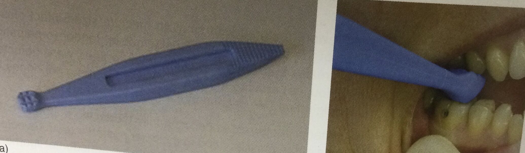 写真のようなプラスチックの棒や割りばしとか丸めた綿とかを、咬んでもらうんです。