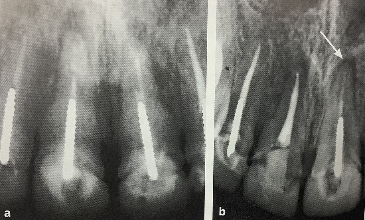 矢印部分にハッキリとしカゲが有りますね左の治療前では鼻が重なっているので、白っぽくて見え難いからでは?